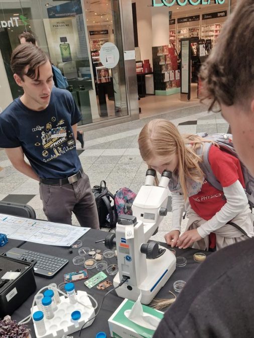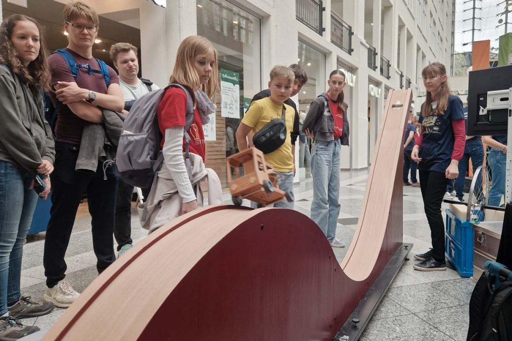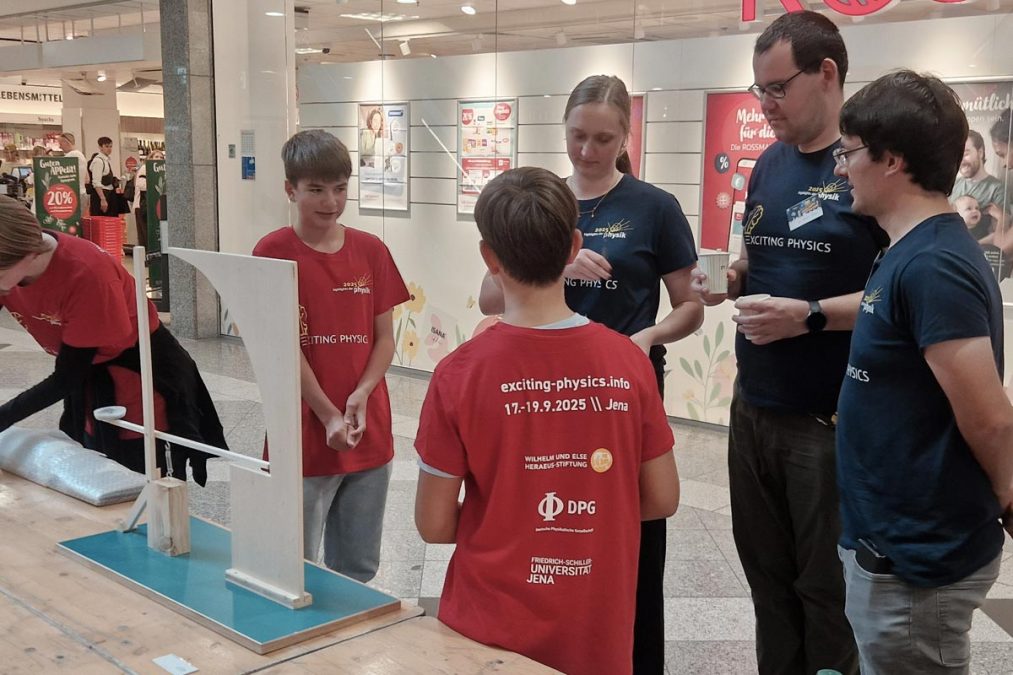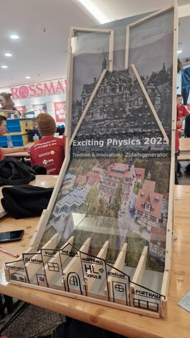 Dort erwartete die Gruppe nicht nur eine Physik-Ausstellung, spannende Vorträge in Uni-Hörsälen oder Gespräche mit Wissenschaftlern, sondern viele Gelegenheiten zum Mitmachen. In der Einkaufsmeile Goethe-Galerie standen eine Reihe spannender Experimente bereit und natürlich waren alle gespannt auf den Schülerwettbewerb „Exciting Physics 2025“. Das Team aus Haubinda entschied sich, an mehreren Disziplinen teilzunehmen. Eine Inspiration aus dem Alltag ergab sich z. B. beim Mittagessen mit einem Löffel auf dem Tellerrand. So baute eine Gruppe eine Federwaage, mit der sie den 2. Preis gewann. Eine Teilnehmerin entschied sich für den Papierturm, der verschiedenen Belastungen standhalten musste – und diese auch meisterte. Nur war die Konkurrenz noch filigraner und leichter gebaut. Auch der Zufallsgenerator, der eine gaußsche Normalverteilung bei Einwurf von Kugeln erzeugt, konnte im Lichte der Konkurrenz leider nicht auf dem Podium landen.