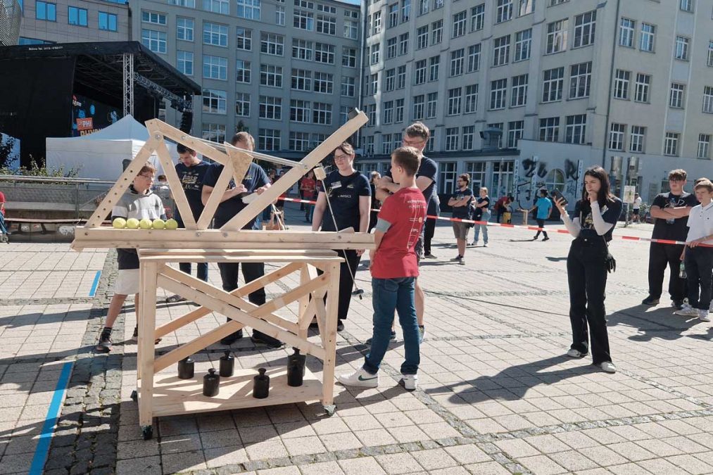 Beeindrucken konnte dafür die Gruppe der Wurfmaschine: Ganze 5 Wochen dauerte die Arbeit an dem guten Stück. Dank der hauseigenen Werkstatt in Haubinda und der tatkräftigen Unterstützung durch Eltern, entstand ein robustes, mannshohes Gerüst aus Holz, das wie ein Katapult genutzt werden kann und bei der Vorführung relativ treffsicher aufgetürmte Dosen abräumte. Das kam bei der Jury sehr gut an und belegte den 1. Platz! Ein toller Erfolg für die Nachwuchs-Physiker.